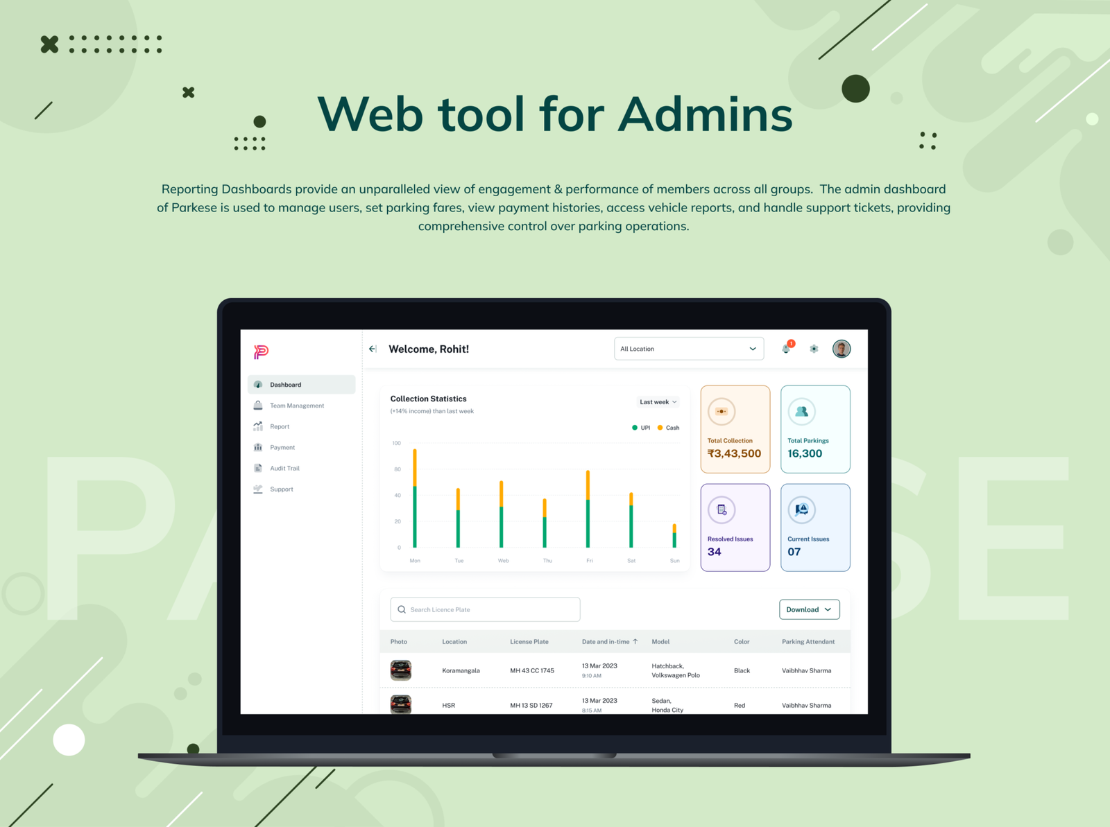 Parkese offers a cutting-edge platform for managing and securing parking areas through ALPR (Automatic License Plate Recognition) technology. The Parkese mobile app facilitates seamless scanning of vehicle number plates, with ALPR capturing the details. Upon exit, another scan calculates the total amount automatically based on the duration of stay. These details are meticulously recorded in the admin dashboard, providing administrators complete control over every aspect of the mobile application’s functionality.
