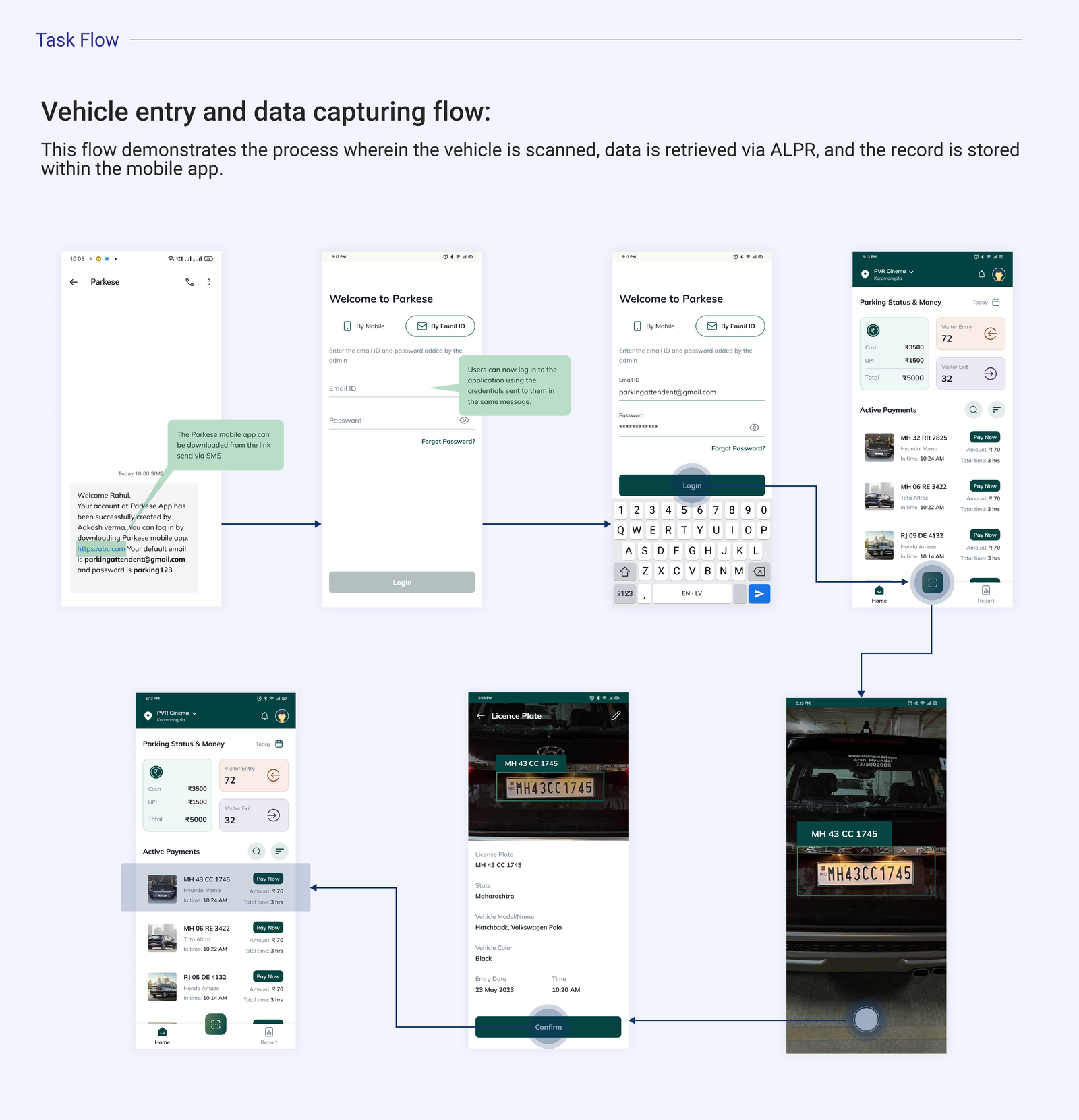 The user logs into the app seamlessly using their credentials. Upon entry, the app automatically captures the car details using the scanning technology. The user then receives a confirmation notification with parking details. The attendant can easily switch locations within the app without any hassle, and the user pays for parking using UPI or cash, with the transaction confirmed instantly. Upon exit, the car details are automatically updated in the system, completing the process efficiently.